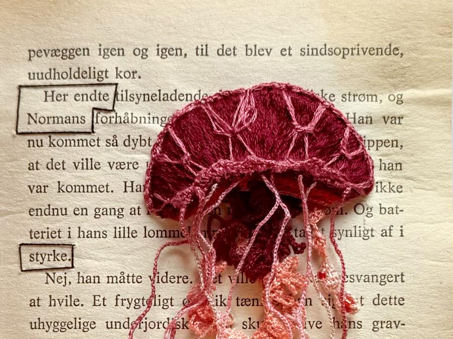I forbindelse med workshoppen udstiller Marianne Nysted sine bogbroderier på biblioteket.
